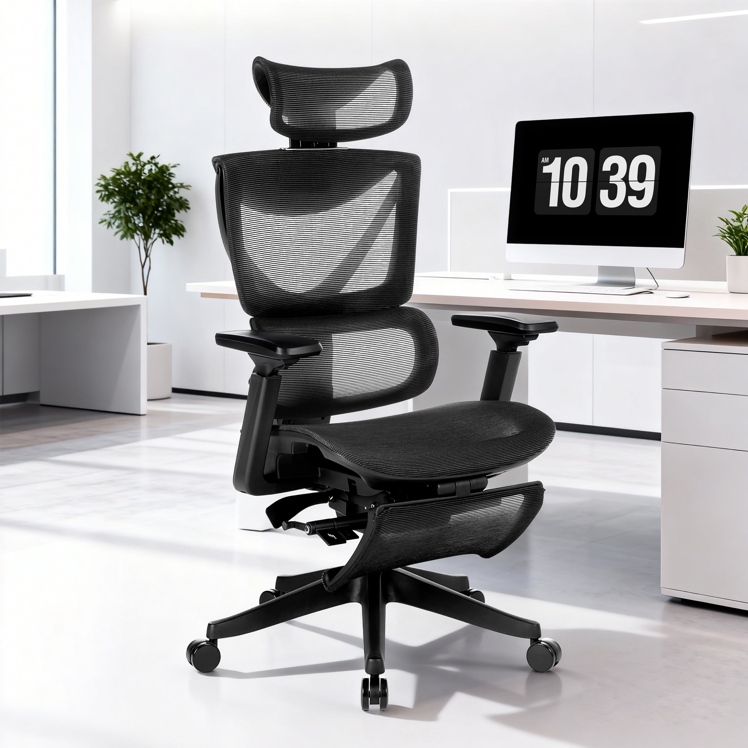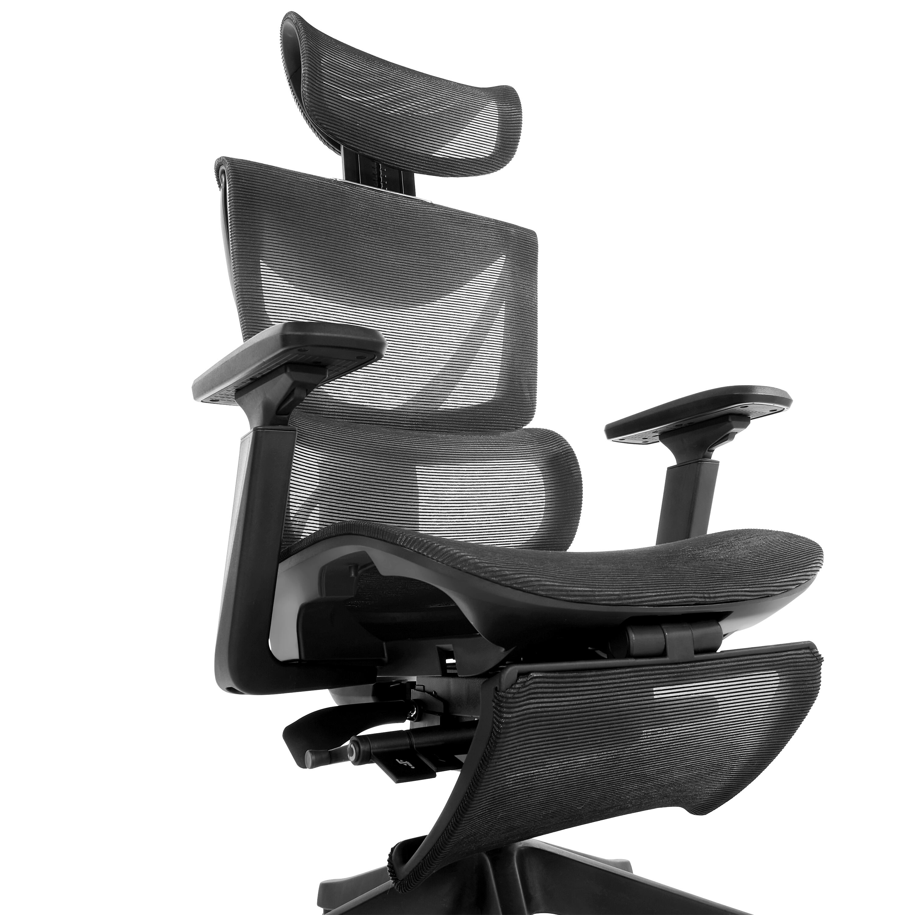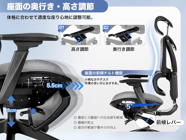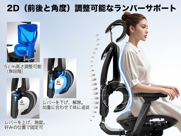 【機能】リクライニングとロッキング機能、さらに高度に調整可能なハイバックデザインが体全体をサポートします。腰を支えるランバーサポートに加え、肘を柔軟に支えるアームレストも搭載し、快適な作業環境を提供します。