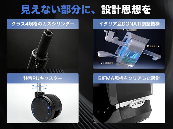 【デザイン】シンプルでスタイリッシュなデザインのCOPILOTオフィスチェアは、どんなインテリアにも自然に溶け込むブラックカラーで、美しいラインが印象を与えます。
