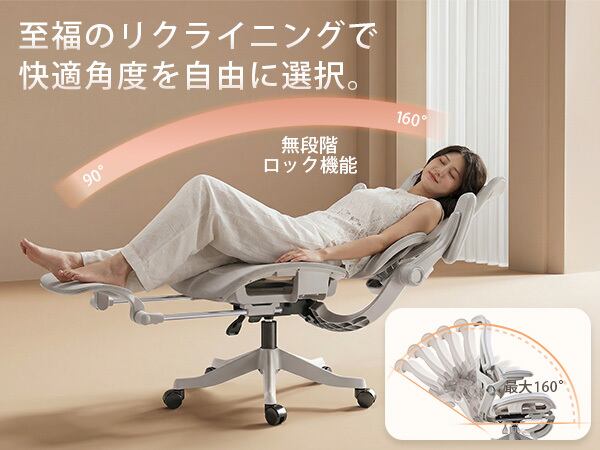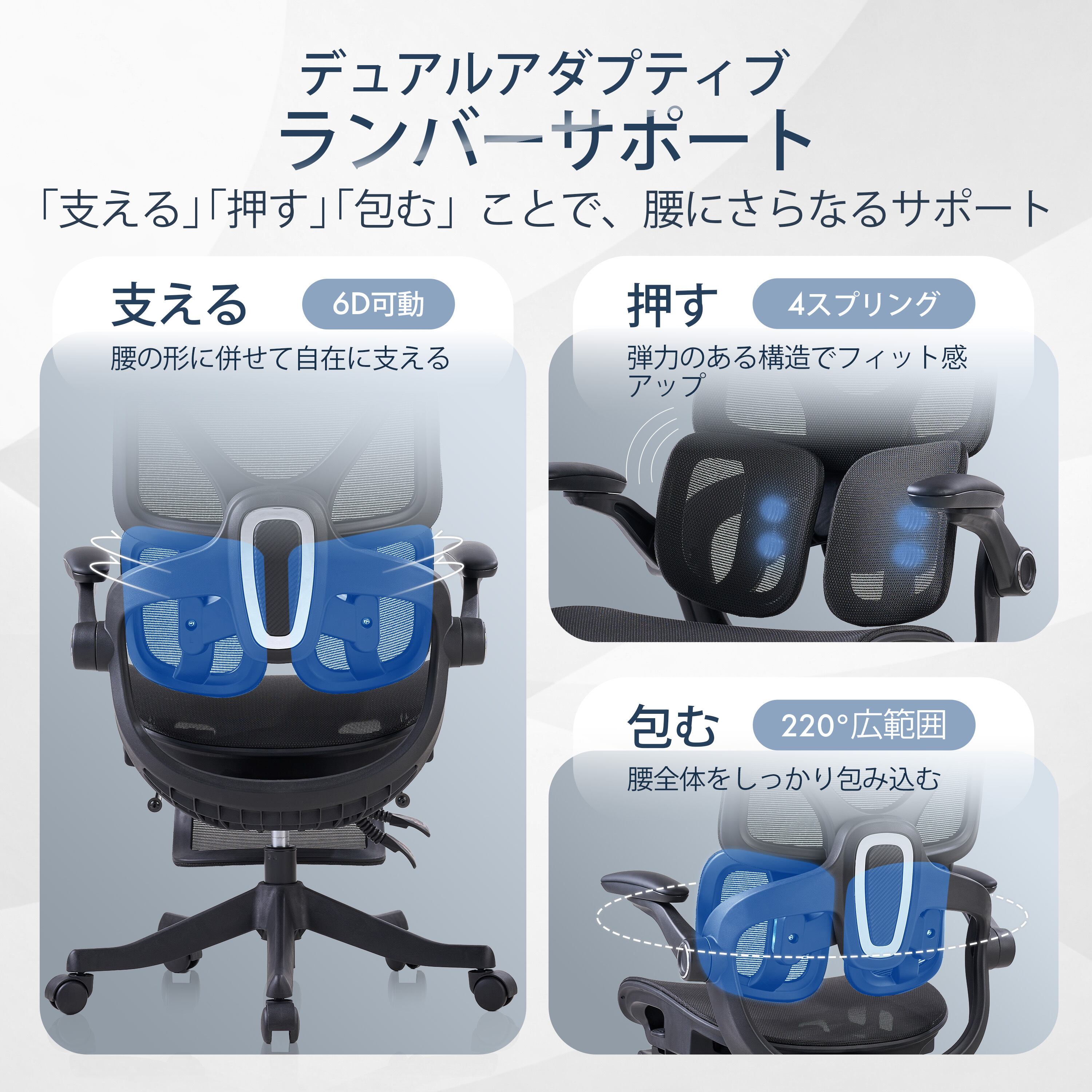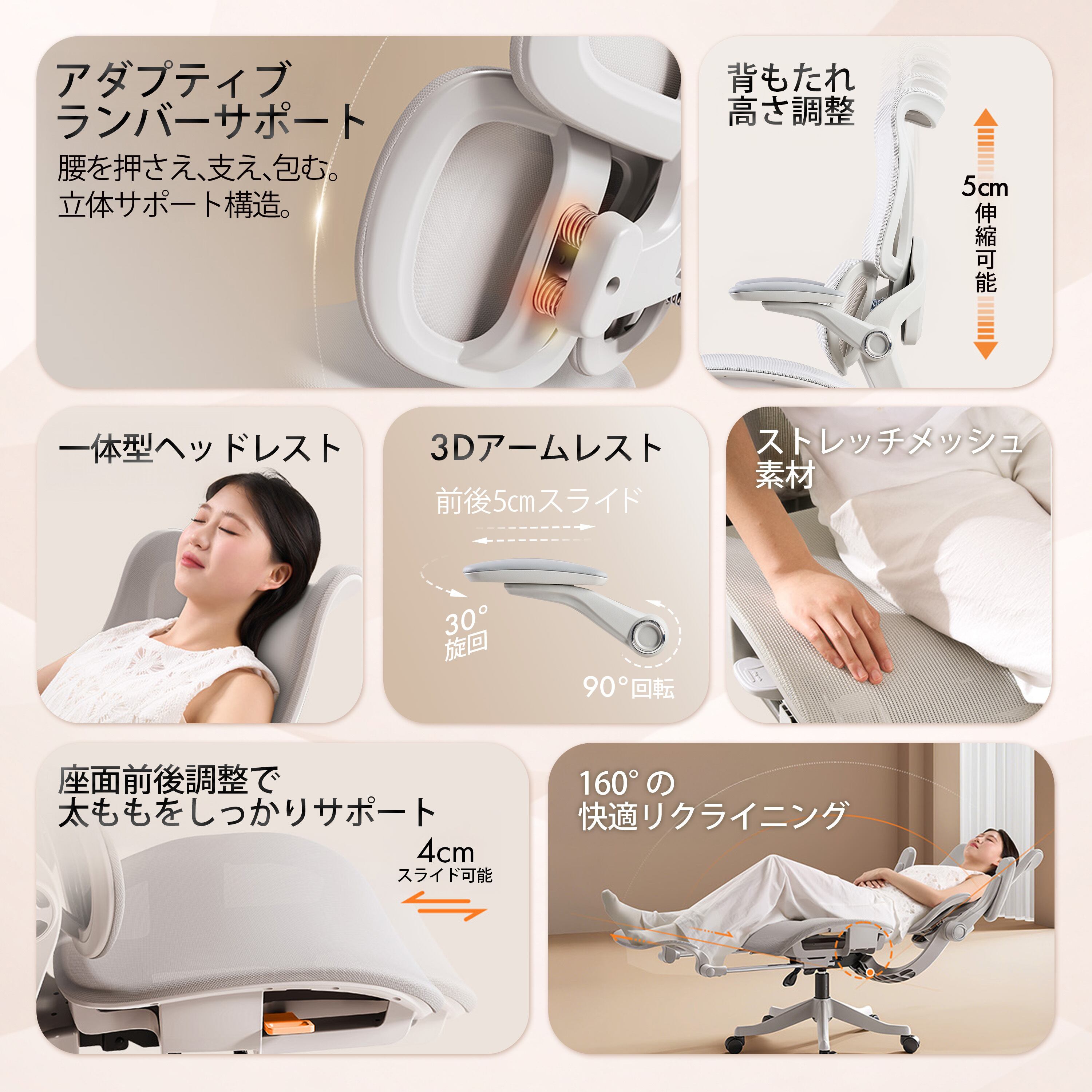 【機能】アームレスト:質感の高いPU素材を採用(メイントップ画像と同仕様)長時間の作業をサポートする機能を多数搭載。一体型ヘッドレスト、リクライニング、背凭れと座面奥行が調整可能、アダプティブランバーサポート、腕をサポートする3Dアームレスト、フットレスト付き